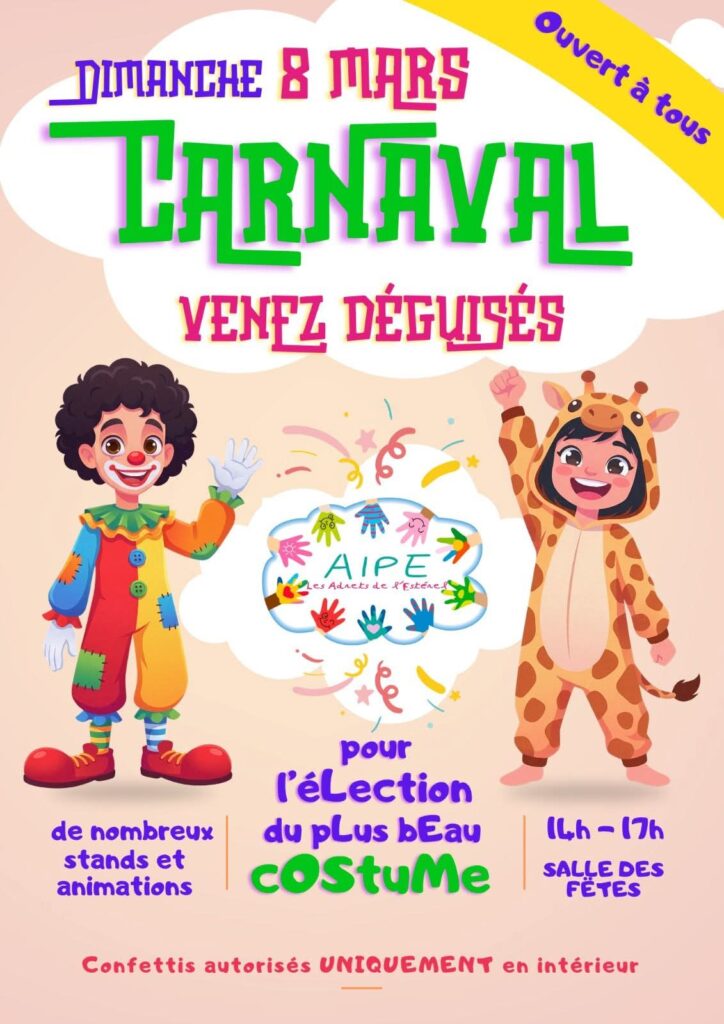 - 8 mars 2026 : Carnaval et concours du plus beau déguisement dans la salle des fêtes de 14h à 17h.